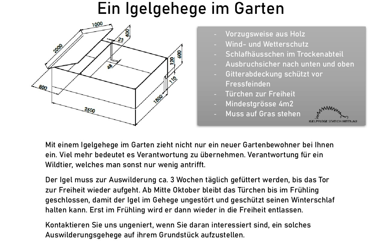 Ziel soll immer sein, den Igel nach dem Aufenthalt in der Station an seinem Fundort zurück in die Freiheit zu lassen. Leider ist das nicht immer möglich und die Tiere werden über ein Auswilderungsgehege an einem neuen Ort ausgewildert, bzw. neu angesiedelt.